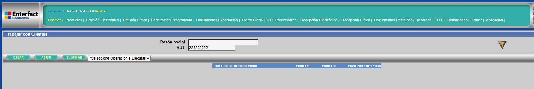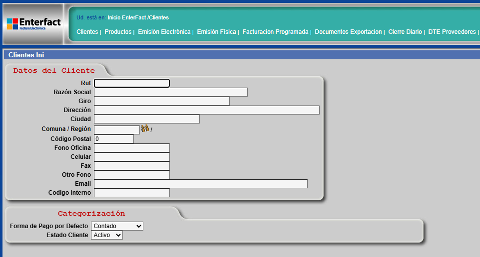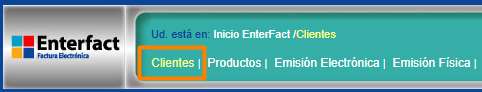 Paso 1: Accede a la plataforma "Enterfac". Una vez dentro, haz clic en el enlace "Clientes" que se encuentra en la parte superior de la página. 🖱️