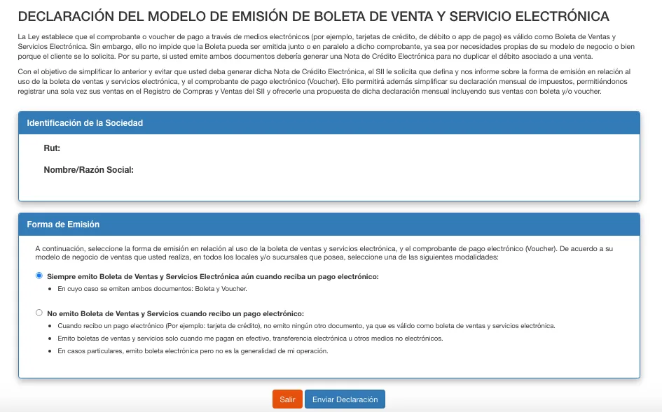 Para declarar el modelo de emisión de boletas de tu empresa, debes ingresar al sitio web del Servicio de Impuestos Internos e iniciar sesión con el con el RUT y clave de la empresa.