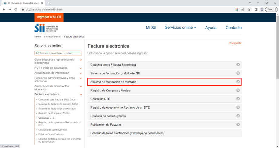 Una vez ahí, hacemos clic en “Sistema de Facturación de mercado”