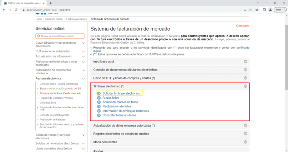 Y nos dirigimos a “Timbraje electrónico” donde haremos clic en “Solicitar timbraje electrónico”.