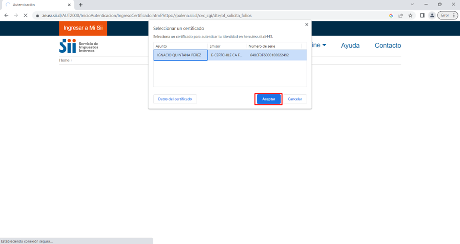 Dentro de este menú, se nos pedirá el certificado de firma digital con el cual realizaremos la solicitud de los folios, le damos clic en aceptar.