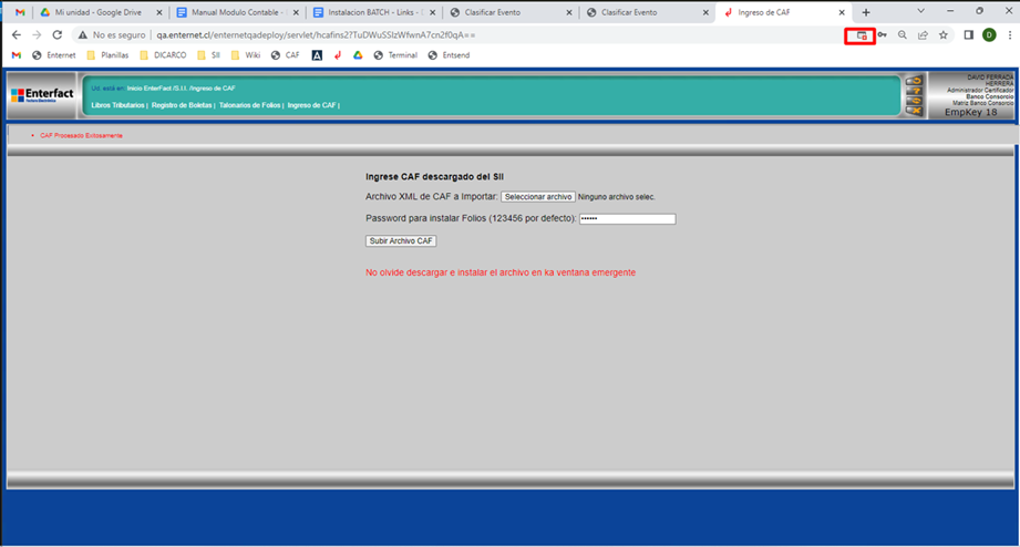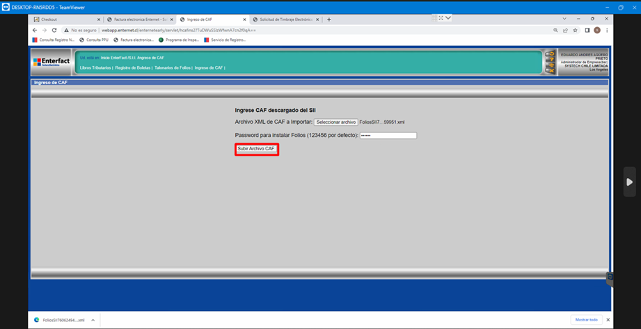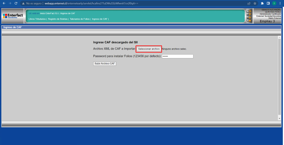 Una vez realizado esto, de debe repetir el proceso de carga de CAF, seleccionando el archivo .XML a subir y haciendo clic nuevamente en “Subir Archivo CAF”