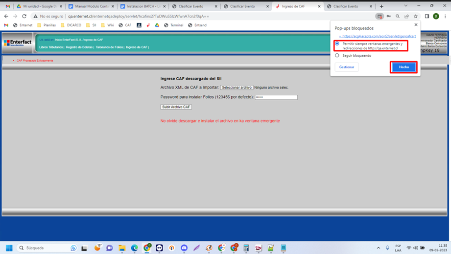 Lo cual nos abrirá la siguiente pestaña, donde permitiremos las ventanas emergentes y hacemos clic en hecho.
