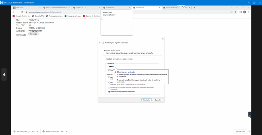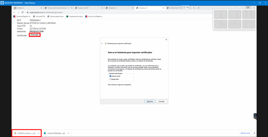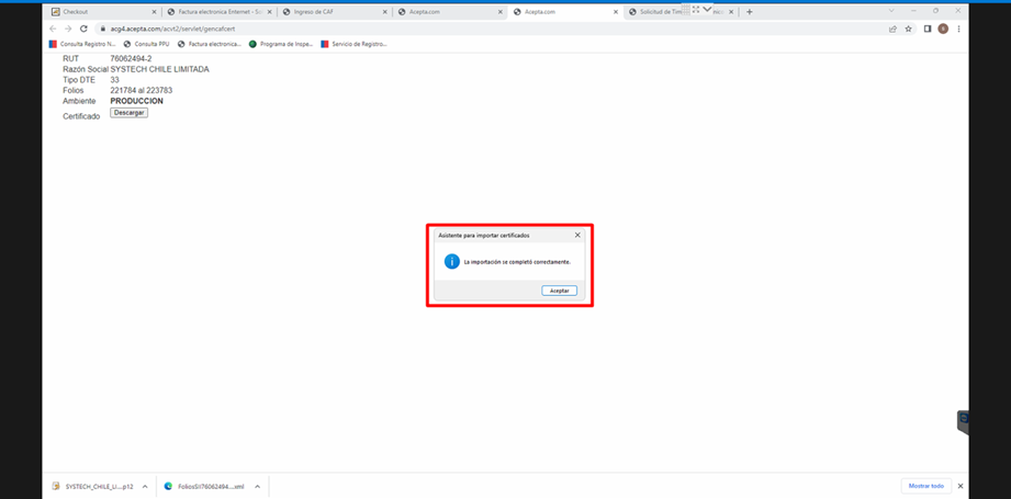 Una vez realizado este procedimiento, se debería desplegar una ventana nueva donde se tiene que descargar el certificado CAF haciendo clic en “Descargar”, lo cual traerá un archivo .PFX, al hacer clic en ese archivo, se nos desplegara la venta para instalar los folios, donde debemos hacer clic en siguiente todo el tiempo.