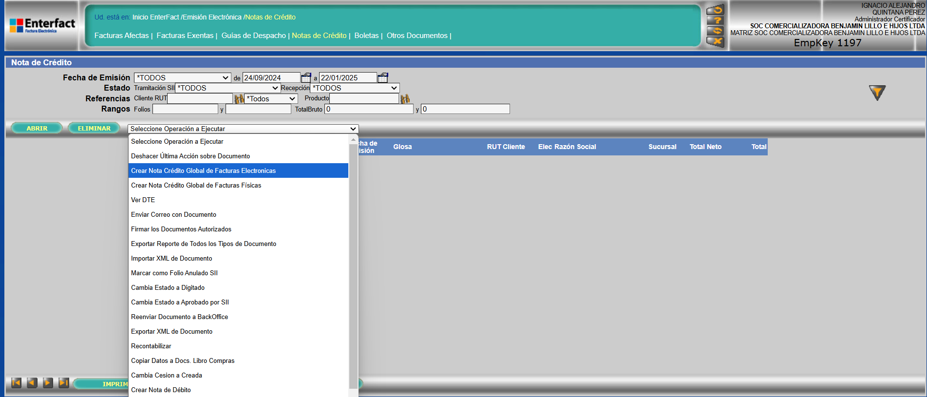 Para poder crear una nota de crédito a boletas será necesario ir a Inicio Enterfact /Emisión Electrónica /Notas de Crédito y hacer uso de la lista “Seleccione operación a ejecutar” donde escogeremos la opción “Crear nota de crédito global de Facturas electrónicas.”