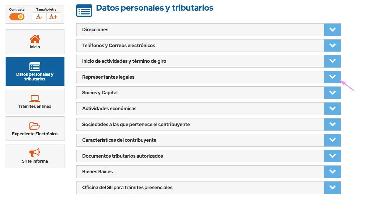 - Busca la sección "Representantes Legales" y haz clic en la flecha ubicada al costado derecho y se desplegará el listado de personas registradas como representantes legales..