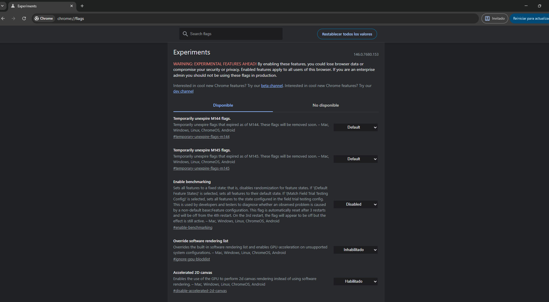 Resultado esperado: Verás una página con muchas banderas (flags) de configuración experimental