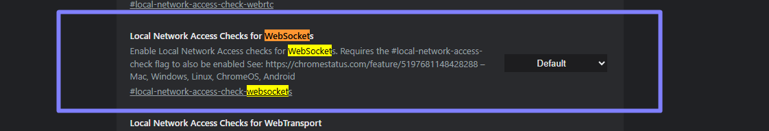 Resultado esperado: Se resaltará la opción "Local Network Access Checks for Websocket"