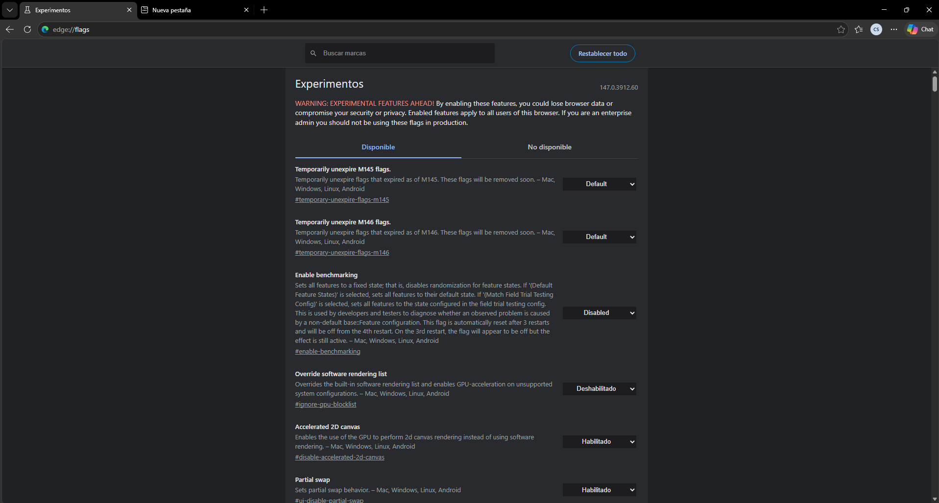 Resultado esperado: Verás la página de configuraciones experimentales (flags)